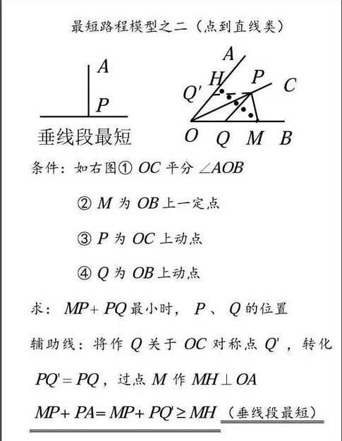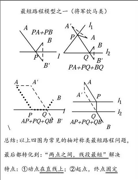 最短路線問(wèn)題通常是以“平面內(nèi)連結(jié)兩點(diǎn)的線中,線段最短”為原則引申出來(lái)的。人們?cè)谏a(chǎn)、生活實(shí)踐中,常常遇到帶有某種限制條件的最近路線即最短路線問(wèn)題.下面簡(jiǎn)單談一下初中數(shù)學(xué)中遇到的最短路線問(wèn)題。對(duì)于數(shù)學(xué)中的最短路線問(wèn)題可以分為兩大類:第一類為在同一平面內(nèi);第二類為空間幾何體中的最短路線問(wèn)題,對(duì)于平面內(nèi)的最短路線問(wèn)題可先畫(huà)出方案圖,然后確定最短距離及路徑圖。