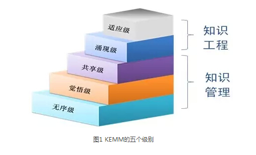 知識(shí)工程建設(shè)是一個(gè)系統(tǒng)工程,不僅僅是一套軟件的交付,它是人、技術(shù)和流程協(xié)同發(fā)展的過(guò)程,是一個(gè)從低級(jí)向高級(jí)發(fā)展的過(guò)程。知識(shí)工程實(shí)施的成熟度模型(Knowledge Engineering Maturity Model,簡(jiǎn)稱KEMM),用來(lái)衡量一個(gè)組織綜合運(yùn)用知識(shí)、實(shí)現(xiàn)目標(biāo)的能力。KEMM模型定義了五個(gè)級(jí)別,分別為1-無(wú)序級(jí)、2-覺(jué)悟級(jí)、3-共享級(jí)、4-涌現(xiàn)級(jí)和5-適應(yīng)級(jí)。
