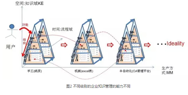 如圖2 所示,以簡(jiǎn)單的任務(wù)計(jì)劃管理為例,口頭管理也是一種管理方式,但對(duì)于管理者的依賴性就很大,認(rèn)真負(fù)責(zé)、年富力強(qiáng)的管理者自然效果更好,記性不好的管理者就總會(huì)顧此失彼,完全不可控、不可重復(fù)、不可復(fù)制,顯然這不是長(zhǎng)久之計(jì)。于是需求推動(dòng)發(fā)展,管理者進(jìn)入了:“好記性不如爛筆頭”階段,管理的效果就會(huì)好一些,減少了波動(dòng);之后使用計(jì)算機(jī)和軟件工具輔助管理,能夠進(jìn)一步提高效率、減少失誤。推進(jìn)“無(wú)紙辦公”引入了辦公自動(dòng)化系統(tǒng),不僅僅是節(jié)約了不可再生的紙質(zhì)資源,也能夠利用計(jì)算機(jī)的快速運(yùn)算、大容量存儲(chǔ)和網(wǎng)絡(luò)通訊等技術(shù),也有利于固化流程,推廣最佳實(shí)踐,將單個(gè)事務(wù)處理流程的效率提高到最大限度,并減少人力消耗。